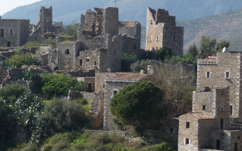 Wahrzeichen der Mani sind die steinernen Wohntürme, deren Höhe nicht nur mit der Abwehrfunktion zu tun hat, sondern auch auf den Rang und die soziale Stellung der Familie hinweisen. Die Bauart wurde von der militärischen Strategie diktiert: wenige kleine Fenster, niedrige Durchgangsöffnungen, mehrere Stockwerke und Zinnen. All dies, um sich gegen Eindringlinge zu wehren. Der architektonische Stil der maniotischen Wohntürme und Festungen aus Stein zeugt zudem von einer strengen Tradition und Kultur, in der der Familienzusammenhalt eine große Rolle spielt. Gekämpft wurde viel, wenn nicht gegen fremde Eindringlinge, dann bekämpften sie sich gegenseitig entweder um das rare Wasser und Anbauland oder aus Gründen der Blutrache. Als wild, freiheitsliebend und unberechenbar gelten die Manioten bis in die heutige Zeit.